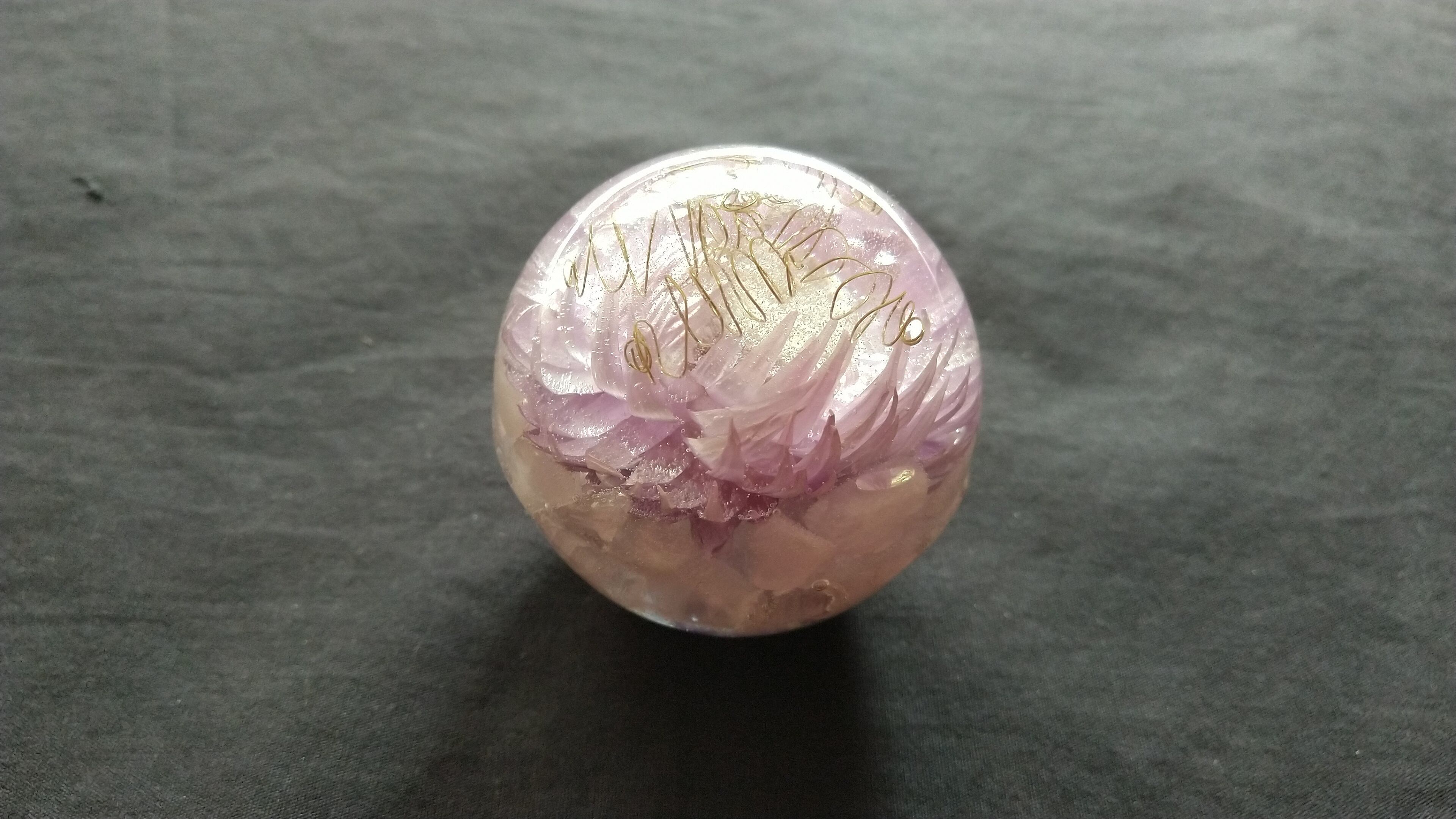 紫はもっとも高貴な色とされており、病を治す癒やしの色であり、火の赤と水の青を合わせた色です。美しい紫色の水晶は誠実さや純粋さの象徴。透明な美しさは神秘的な力のシンボルであり、あてなる(優雅な)ものとしても好ましがられるオルゴナイトです。