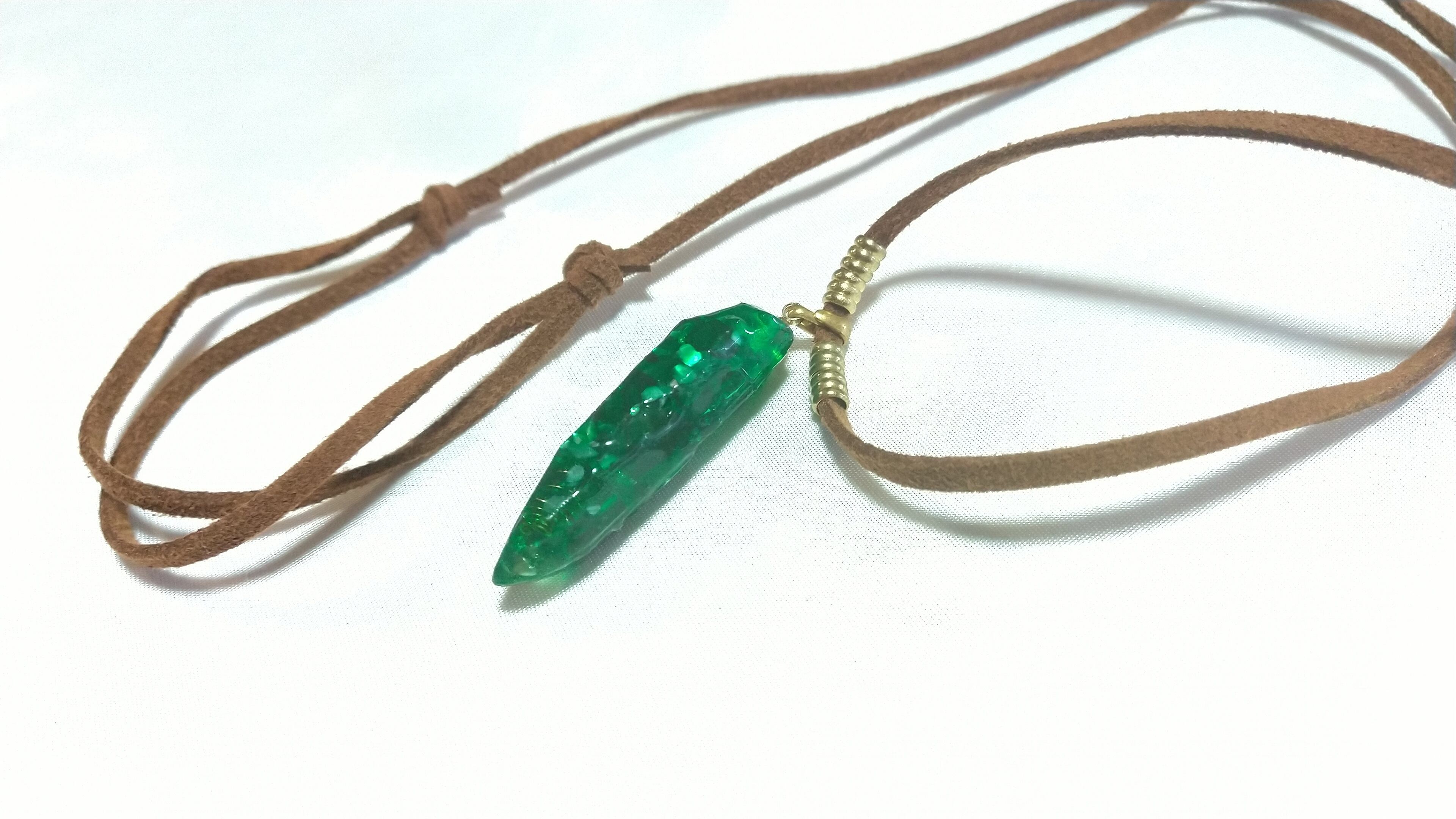 緑色は草木や植物の色であり、調和や共存・共生といった集団を穏やかな状態に導く効果があると言われます。また、生命力の象徴であり、生命機能の改善、回復に働きかけます。命が安らぎ、癒され、リフレッシュしますようにと祈りを込めた緑色の太陽の光をイメージしたオルゴナイトパワーペンダントです。